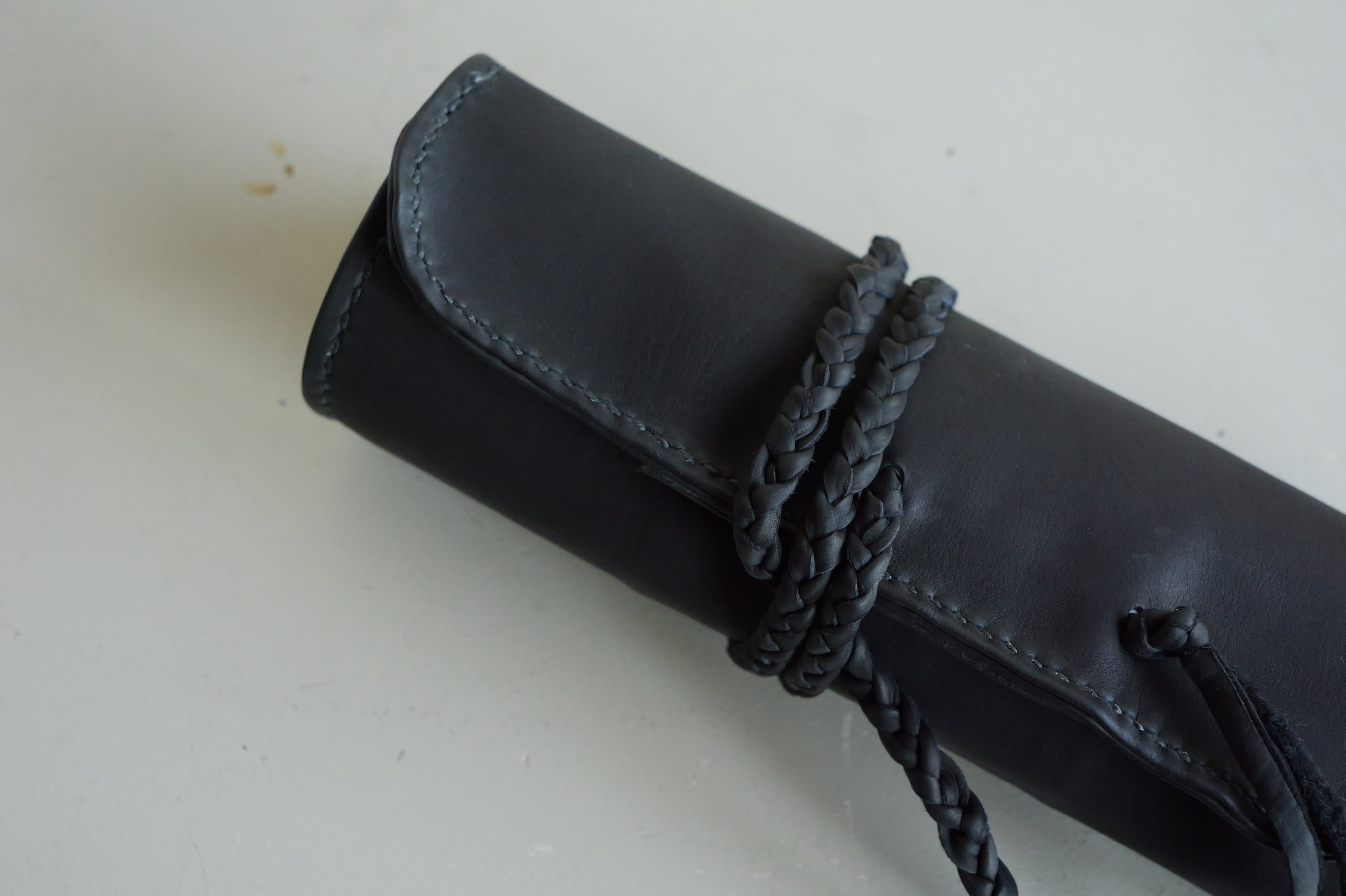 なるべくマットで柔らかい革で、とのご注文でしたので、牛革の種類の中の「キップ」と呼ばれる繊維の細かな革を使い、くるくると巻いて使えるものにしています。