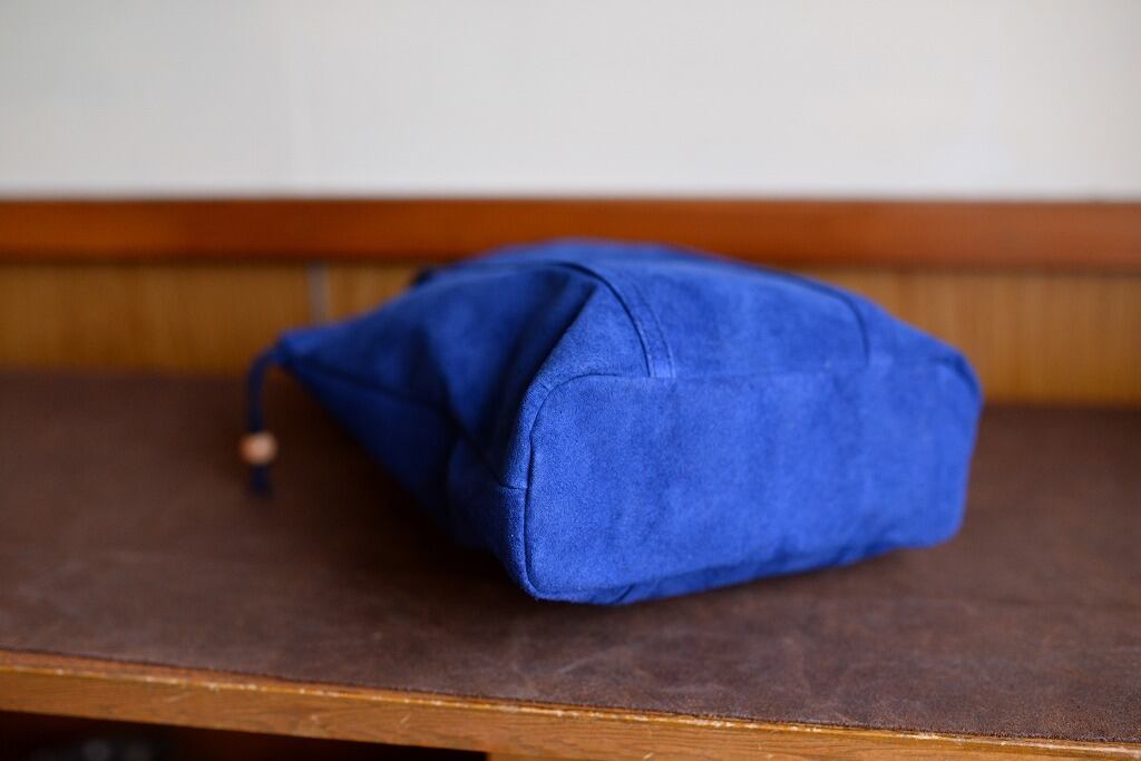 お客さまが持って来てくださったバッグをもとに、青いピッグスエードを使って制作した巾着型の小さめのバッグになります。