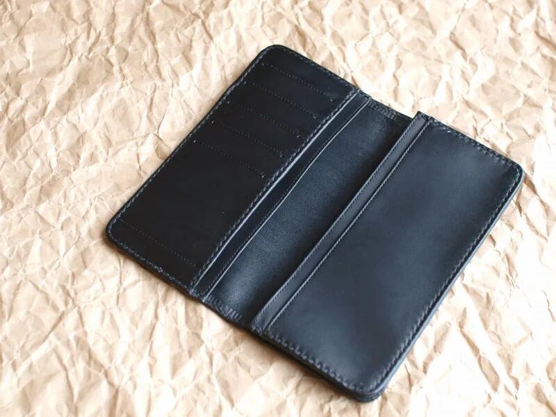 また財布の方は、お札が沢山入るようにとマチを広めにし、小銭入れの無いシンプルなものに仕上げていますが、革の質感や少し細めの糸で手縫いをしたことで上品な印象のものになったと思います。